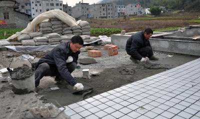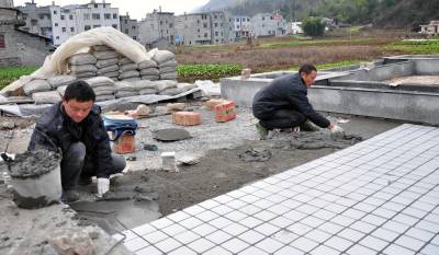 9日,巴东县官渡口镇火峰村文化体育广场建设工地现场,工人在铺设广场地面砖。据了解,为让村民健身、休闲、参加文化活动有场所,该镇投入资金41万元在火峰村建集篮球、健身器材、舞蹈等设备设施为一体的文体广场,本月底投入使用。(视界网穆世祝摄)15335850858