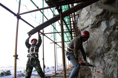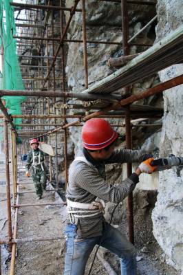 1月10日,两名小女孩正从生态景观长廊施工现场旁走过。据悉,总投资600余万元的生态景观长廊项目位于三峡库区秭归县城出口一级公路控制性工程陈家冲大桥东桥头,总长800余米,重点对37根挡土护坡钢筋混凝土柱进行装饰,突出防滑护坡和生态美化两大功能。该工程自2014年12月初开工以来进展顺利,目前正在加紧施工,可望在今年2月10日前竣工,届时秭归县城又将新添一大景观。