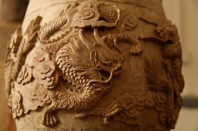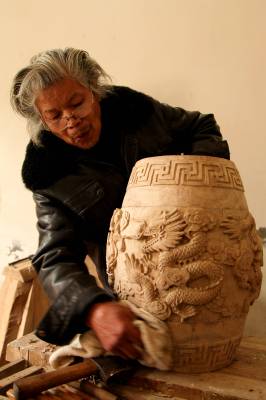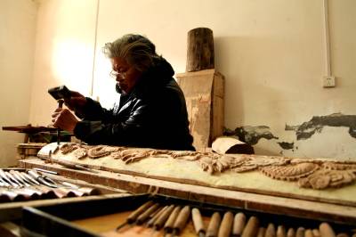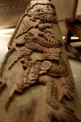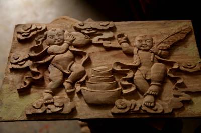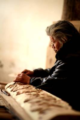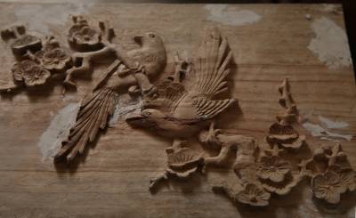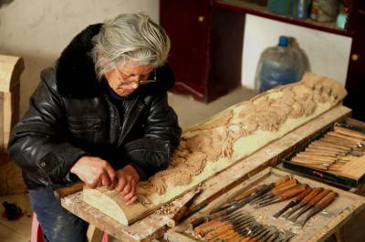 一张宽宽的板凳上面摆放着正在雕刻的仿古建筑木雕件,板凳前面满满一盒大小不一的刻刀、马牙、矬子等各种工具,这就是何师傅的木雕工作台。年近七旬的何师傅点了支烟,坐在矮凳上开始雕刻,其上双龙戏珠形状已清晰可见。“笃笃笃”,低沉的敲击声在房间里时断时续,刻刀下木头的花纹越来越清晰,在这里时光仿佛静止了。何师傅沉浸在自己的世界里,衣服上、指甲缝里满是樟树的木屑,连手部皮肤仿佛也被木头染过。何师傅说,木雕活非常辛苦,长时间低头雕刻,特别费眼睛,对脊椎造成的压力也大,其辛苦外人很难了解。