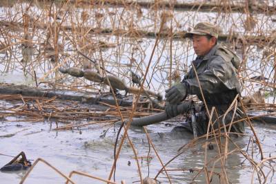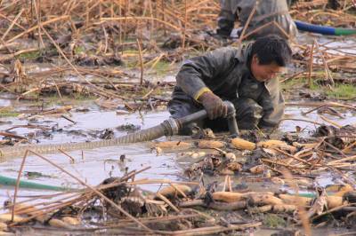 1月11日,竹山县麻家渡镇柿树坪村藕农正在利用水冲式挖藕机的高压水枪挖藕。近年来,该镇引进鄂莲5号、6号等优质品种,发展露地(水生)蔬菜1256亩。同时使用优质农家肥,病虫害防治以生物防治为主,亩产达到4000公斤,亩纯利4000元,人均增收1500元,为当地提供就业岗位450个。
