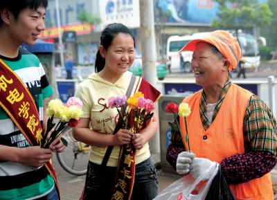 母亲节的祝福昨日是母亲节,黄石理工学院机电学院的青年志愿者将自己亲手制作的300枝康乃馨免费送给街头行人。图为两名志愿者将两枝康乃馨送给一名正在街头扫的的环卫工,祝她母亲节快乐。记者邱孝威摄