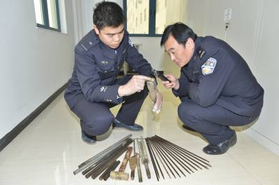 1月12日,湖北宜城警方宣布,经蹲点守候、围追堵截,打掉“2014.12.10”盗掘古墓葬流窜盗掘古墓葬团伙,抓获正在实施盗掘古墓葬的辽宁省籍犯罪嫌疑人王某等3人,收缴作案车辆、探灯、洛阳铲、绳索、排水通风设备、运土设备等大量作案工具。图为,民警清点作案工具。