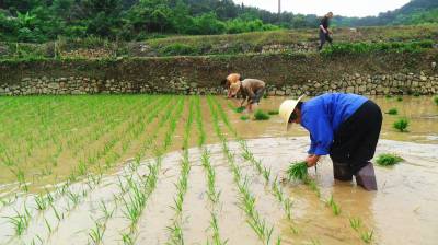 栽秧关秧门 栽秧时,农人颇多忌讳:插每块田第一行秧时不得开口子,一人直接插完一行;不互传秧把;不可把秧把甩在别人身上。寓秧苗生长顺利收成好。其他人则在第一行秧的翼上按大行子(即行距)、小行子(即株距)的尺寸要求接着栽秧。栽秧时,一只手握半把秧并用大指和实指迅速分出栽一窝的四五根秧苗,另一只手取来栽一窝的四五根秧苗垂直插入泥巴中,秧苗不能弯曲,否则成活慢,产量低。当年栽最后一块田的最后几行秧时,农人俗称关秧门。关秧门时农人有扳仓的习俗。即栽完该栽的翼上的秧以后,需把手中多余的秧苗全部栽在田边水中,留作以后补秧用。随后迅速站到田堤上,不分男女老少相互朝对方身上扳泥巴,尽管满身泥水,还欢快跳跃,笑声不断,是农人结束农忙欢乐心情的表露。1995年以后,青年男女外出打工多,种田靠留守老人和妇女,虽然抛秧技术和机械插秧得到推广,但栽秧习俗仍被山区农户传承,扳仓习俗消失。(视界网 袁国悦摄)