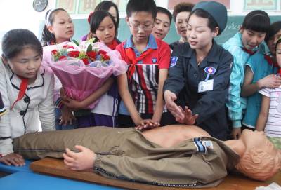 昨(10)日,荆门二医急诊科的护士在指导学生做急救护理演示。东宝区大桥小学师生与荆门二医急诊科的护士们共同迎接国际护士节,小学生们献上了鲜花和贺卡,”白衣天使”给师生上了一堂生动的急救护理知识课。(本报视界网宁新生摄)