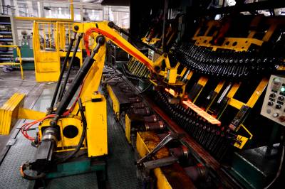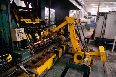2015年1月16日,东风汽车悬架弹簧公司高新工厂热处理一线机器人正在淬火线生产。