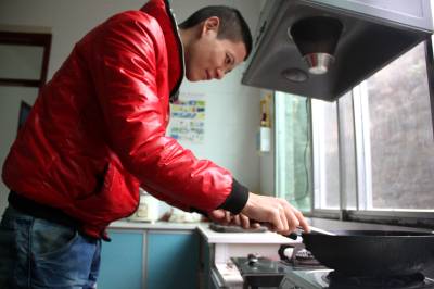 1月17日,建始县花坪镇村坊村一组村民刘斌在利用沼气灶炒菜做饭。