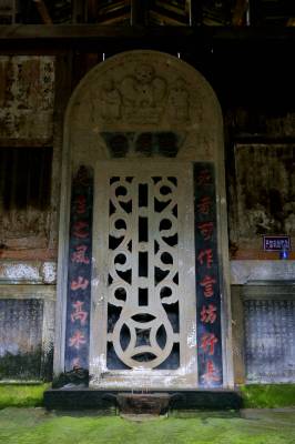 与一般墓葬相比,罗家碑屋的确有它的特殊之处:一是墓碑立在堂屋代替家神。堂屋后壁立一座墓碑,高约4米、宽1.8米,墓碑两侧镶嵌两块石刻墓志铭,整个墓碑组成了堂屋的后壁,外看是屋,进屋见碑。
