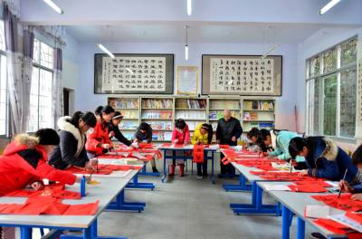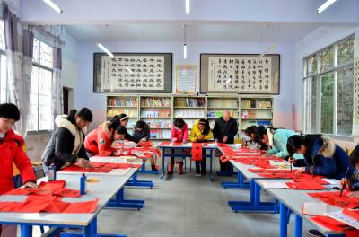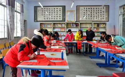 “过几天爸妈就要回家过年了,大红的对联喜庆,寓意吉祥,写幅对联是迎爸妈的最好方式”,1月17日,恩施州宣恩县民族实验中学“留守学生”书法免费培训班的学生在写春联,迎接外出务工的父母归来。