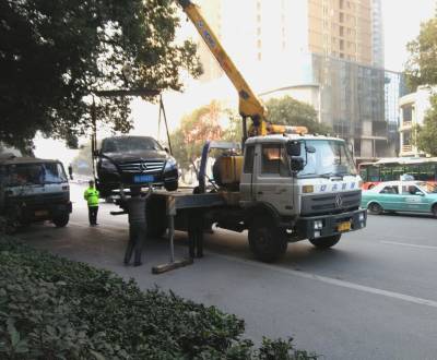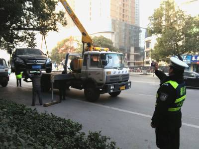 1月18日,十堰市交通警察正在人民路对路边的违章违规停放的车辆进行吊拖。