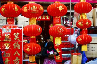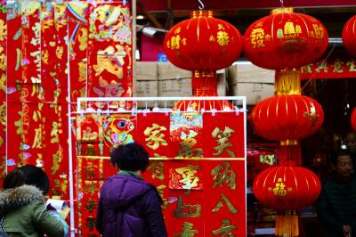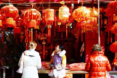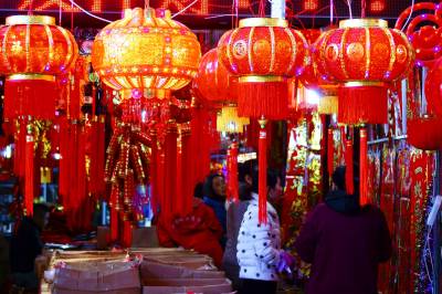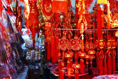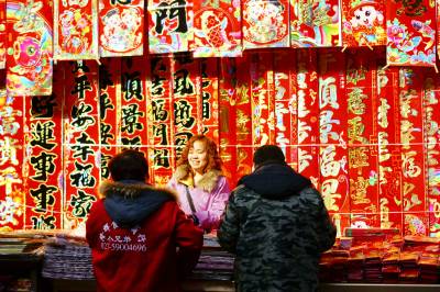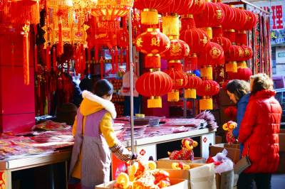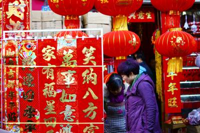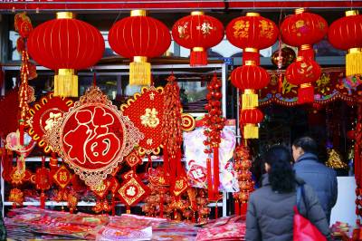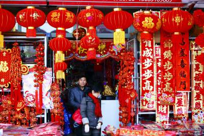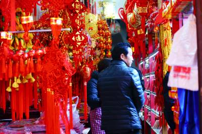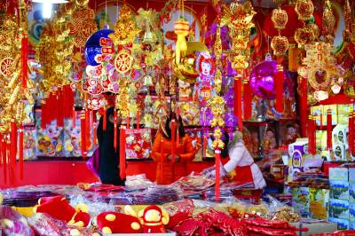 1月22日,湖北宜昌市民在节庆批发市场上选购新年饰品。随着新春佳节的临近,湖北宜昌各大超市、商店及节庆批发市场的年货饰品琳琅满目、红红火火,大红灯笼、大红“福”字、春联、中国结等喜庆饰品开始热销。本报视界网 周建平 摄
