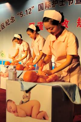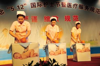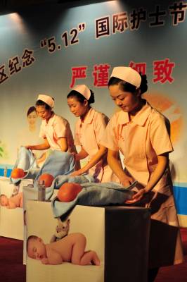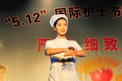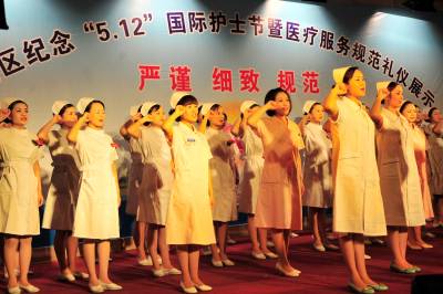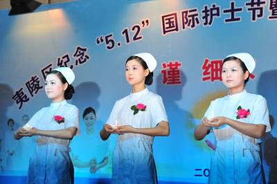 2010年5月10日晚,湖北省宜昌市夷陵区举行纪念”5.12”国际护士节暨医疗服务规范礼仪展示活动,300多名”白衣天使”现场展示新生儿抚触、外伤病人包扎、入院就诊流程和”六步”洗手法等医疗服务规范礼仪,共同庆祝”5.12”国际护士节,并一起宣誓承诺,继续传承和发扬南丁格尔精神,维护医术圣洁,服务人民健康,努力做圣洁的”白衣天使”。本报视界网签约摄影师张国荣摄