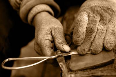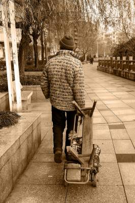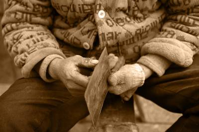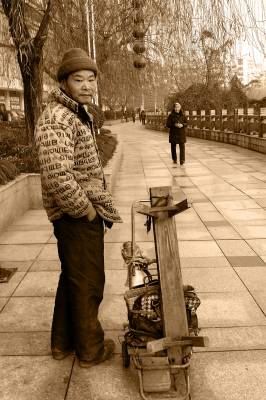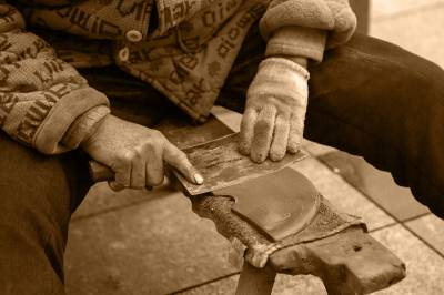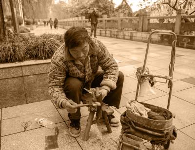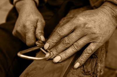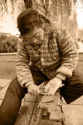 出现在我面前的磨刀人大名郑田珍,64岁,他告诉我,从“文革”时期起,他就在恩施市区内的大街小巷四处游走,学着《红灯记》里那位磨刀人扯着嗓子喊“磨剪子来,戗菜刀”,这一磨,竟然磨了四十多年,从青年磨到了老年,磨去了几十年的光阴,磨出了一家人的开销。他说,现在这样的小手艺也很难做了,很多家庭的刀子、剪子质量相当好,已经不需要经常打磨了。虽然是小手艺,但郑师傅做得十分投入,他会根据顾客拿来的刀、剪的新旧以及钢火程度,区别对待,先是粗磨,然后用毛巾擦拭干净后再细细打磨,直到顾客满意为止。他还即兴给我唱了一段“磨刀歌”:“ 上头有个张铁匠,下头有个李铁匠,打把刀子柳叶儿弯。一边陡,一边光,菜儿放在砧板上,慢慢切,慢慢走,锅里炒得喷喷香。” 声音粗壮带点悲凉。他告诉我,一天下来,除去他和老婆的生活开销,还可赚个几十元,他已经很满足了;他的儿女都已成家立业,不再需要他来操心。极其简单的工具,不太复杂的手艺,磨出了老郑老年的安稳自足,这是一个磨刀人的梦。