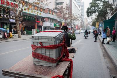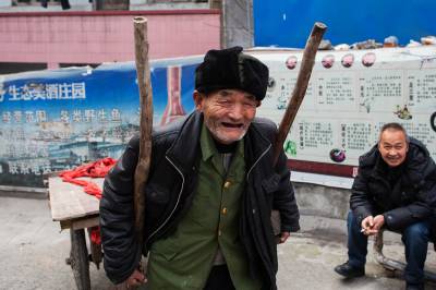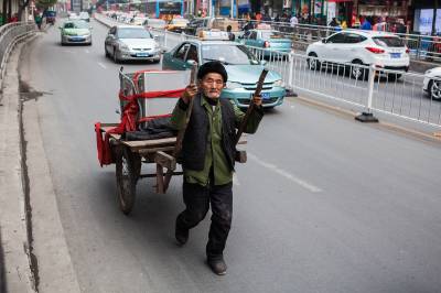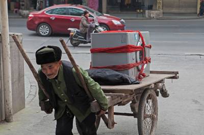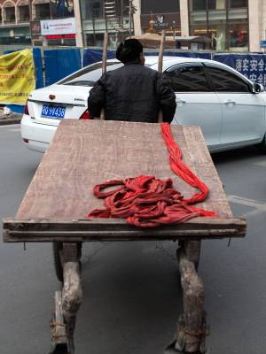 拍摄时间:2015年1月17日;拍摄地点:恩施市;作者姓名(实名):陈力;工作单位:恩施州商务局,通讯地址:恩施市清江东路9号州商务局;邮编445000;手机:13907269510;民俗事项说明:板车师傅张世俊是恩施市的一位农民,今年74岁了。打从允许农民进城务工那时起,他就进入恩施土家族苗族自治州的首府恩施市靠拉板车搞短途搬运谋生,和重庆的“棒棒军”一样,拉板车也是一项很原始的卖力气活。时至今日,和他一道进城拉板车的兄弟们,有的开上了出租汽车,有的早已改行作了其它生意,再不济的也换了机动三轮车。唯有张师傅,自觉年纪大了,又不识字,盘不好“机械化”,还是靠拉板车谋生。他无儿无女,只身一人在城里闯荡,一人吃饱,全家吃饱。虽然已年过七旬,但身子骨还硬朗,目前还能扛着一百来斤的家俱如洗衣机连爬几层楼不歇息。有好多请张师傅搬运家具的东家,心肠好,看他是一位孤人,往往在讲好的费用上再格外多给张师傅一些。偌大一个恩施山城,好心人很多,发善心的人多,体贴这位山城最后的板车夫,情理之中。再加上国家对孤寡老人的救助政策及农民养老金的支持,张师傅算得上不愁温饱的老头。