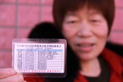 1月21日,竹山县政协委员蔡云展示该县司法局发放的法律服务志愿者便民联系卡。日前,该县司法局以“两会”召开为契机,印发了千余张法律服务志愿者便民联系卡,发放到人大代表和政协委员手中。联系卡上印有法制宣传、法律咨询和法律援助服务事项,公开全县法律援助律师、各乡镇司法所长和职务和联系电话,县法律援助中心法律服务热线电话及办公室法律援助监督电话,发放到全县各机关、各单位、各乡镇、各位人大代表、政协委员手中,为广大人民群众及时提供法律援助。