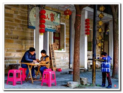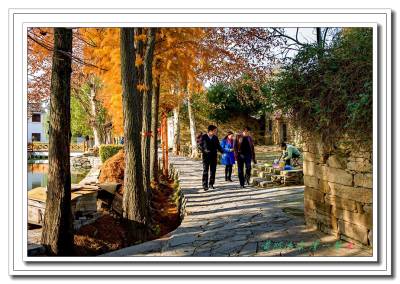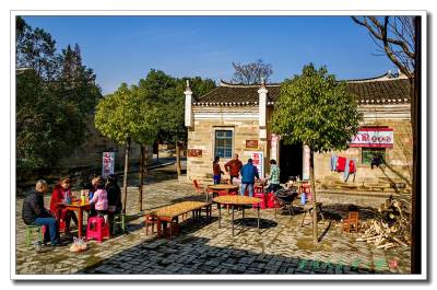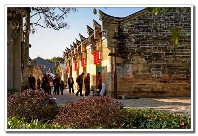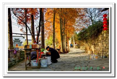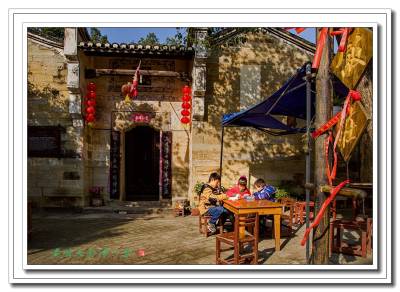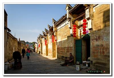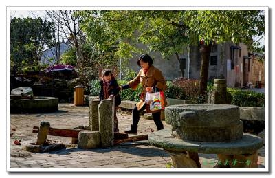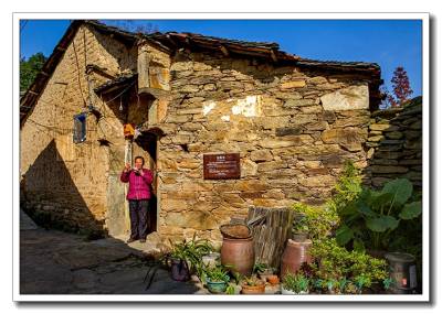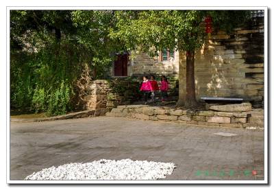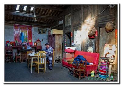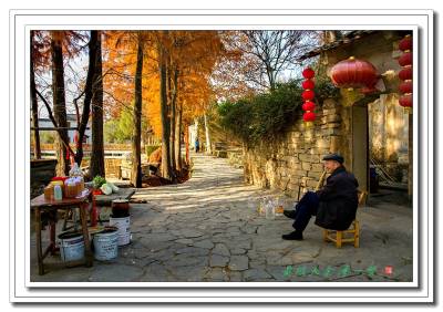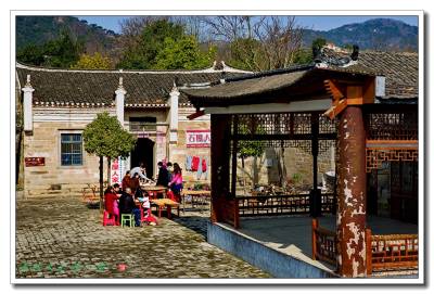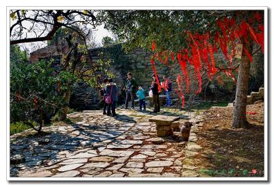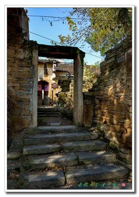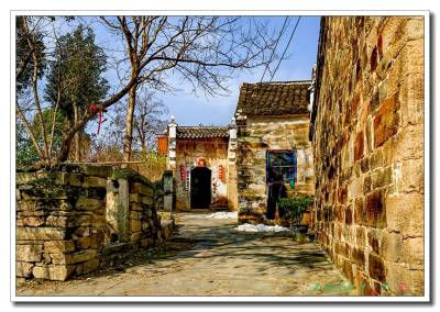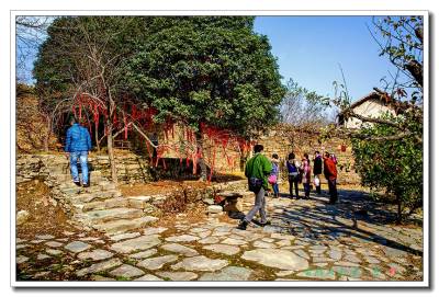 走进小溪环绕的村口,青石小径蜿蜒前伸,一幢幢古旧的房屋连环而建,一律的青条石墙,黑瓦飞檐,形成院落交错的小巷,石磨、古井、油漆斑驳的木亭散布其间,偶见残缺的木石雕刻、画梁牌匾,依稀可以想见旧时的精美。大余湾村寨后面群山连绵,乃是木兰山余脉,不远处,滠水河似一条银色的飘带,环绕山岗缓缓流淌。山势不高,不一会我们就爬上了山顶,品访了文昌阁,眺望山下,大余湾的全貌一览无遗,大余湾就静卧在这青山绿水间,气定神闲。