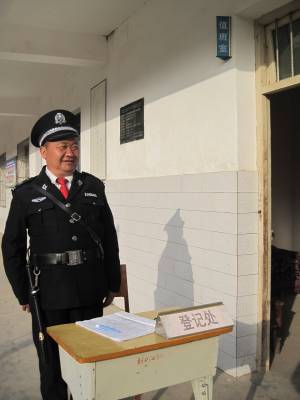 针对近期我国部分地区发生的校园安全事件,郧县县政府、教育局高度重视该县的校园安全工作,近日郧县各学校安全保卫工作全面升级,不但号召各学校成立应急分队,还为学校门卫统一服装,配备了电警棍、橡胶棒、辣椒水等必要装备。(图为郧县刘洞镇九年一贯制学校门卫在岗执勤)(湖北省郧县刘洞镇九年一贯制学校高超/摄邮编442525)