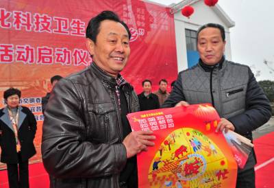 宜昌市“三送”下乡活动给农民带来实惠 1月27日,宜昌市委宣传部相关负责人向宜都市红花套镇吴家岗村赠送有关社会主义核心价值观内容的年画。当天,宜昌市“三送”下乡活动在宜都市红花套镇吴家岗村举行,该市宣传部门牵头并组织文化、卫生、科技、农业等12部门,把农村群众迫切需要的农业实用技术、科技图书、卫生健康知识等送到了农民的家门口,并现场发放科技图书和农业宣传资料1万多份,吸引当地3000多农民踊跃参与。 湖北省宜都市委宣传部:曹礼达摄
