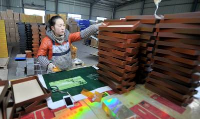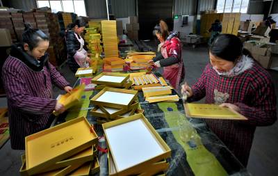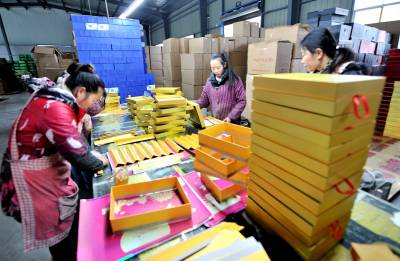 1月27日,在位于宣恩县椒园生态产业园的湖北巴楚风印务有限公司加工车间,工人正在抓紧制作包装盒。该公司由为集设计、印刷、生产一条龙,礼盒、普箱、塑料包装、环保拉罐配套生产于一体的综合性包装生产企业,由返乡务工人员龚道创办,拥有员工120人。