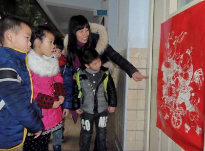 江汉区唐家墩小学,在羊年的新春佳节即将来到之际,在师生中开展中华传统文化展示月活动。走进这个校园,你立刻会感到告别了严寒的冬天,走进了温暖喜洋洋的春天。全校32个教室,每个教室前门都贴了喜迎佳节的红彤彤春联,后门也都贴了有着历史悠久传统的红色年画,让师生们在张贴春联和年画中,感受到在用行动传承和发扬中华传统文化喜迎羊年,减少了他们期末考该的压力。同时师生们将在寒假里,开展中华传统文化社会实践活动,办一张中华传统文化社会实践行的小报,深入社会和家庭,搜集一批中华传统文化的实物和史料,寒假过后,羊年新年开学准备在校进行展出。1月26日,一年级的杜艳林教师(中),在为她班同学讲解历史悠久传统年画的来历。