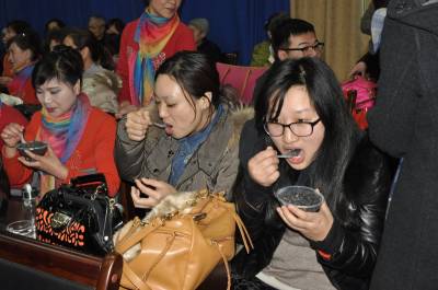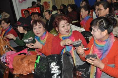 2015年1月27日是农历的腊八节,湖北宜昌市翁家堰社区的居民喝着腊八粥,看家庭才艺表演,喜气洋洋迎新年。