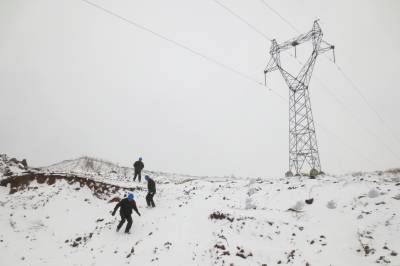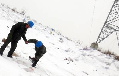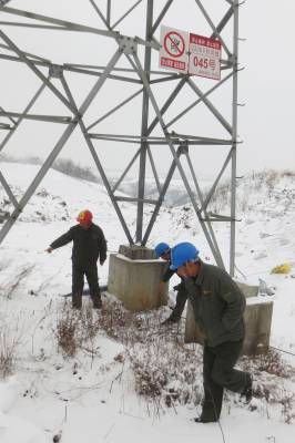 1月28日,老河口市迎来2015年的首场降雪。当天上午,该公司组织工作人员来到正在建设的老谷高速施工现场,对跨越高速公路的220千伏丹河线45号铁塔的塔基进行巡视,防范大雪覆盖后土壤塌方造成铁塔倾斜等安全隐患,确保电网安全运行,全力服务高速公路建设用电。图为该公司工作人员在巡视铁塔和周边线路。(郭峰 13995745131)