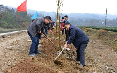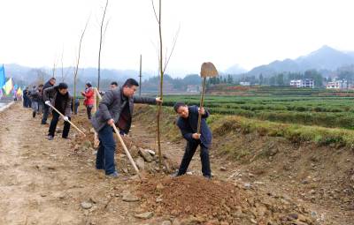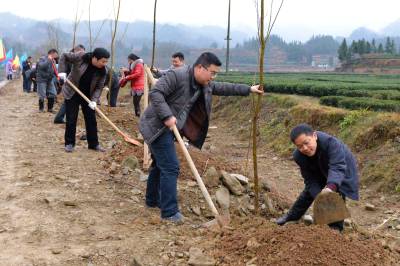 “绿满荆楚”在行动 28日,咸丰县百余名干部职工挥舞锄头栽植生态树。 咸丰县辖区国土绿化率达83.2%,城镇人均拥有绿地面积26.4平方米,珍稀苗木保有量达650万株,是武陵山区“绿色后花园”。今年,咸丰县引领带动广大群众栽种生态树、产业树、景观树,户平栽植50棵以上珍稀树种,纵深推进“绿满荆楚”行动。(本报视界图片库 通讯员宋海燕摄) 联系电话:13402736937