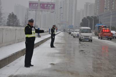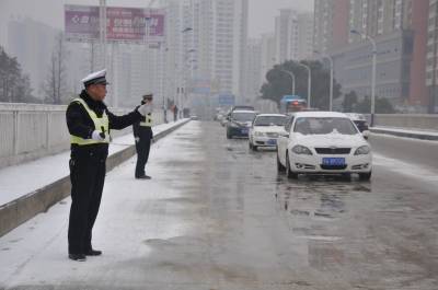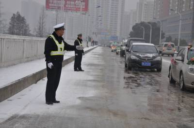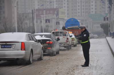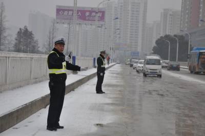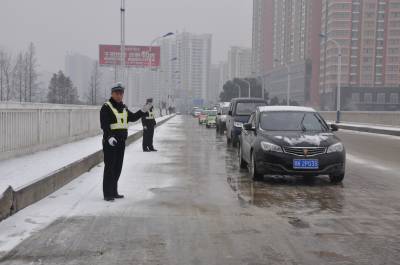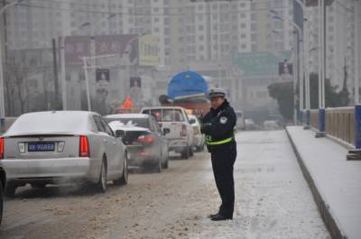 1月29日,汉川市公安局交警大队的执勤民警在风雪中认真地开展路面执勤、交通疏导、应急处置及设置中心隔离设施等工作,确保全市道路交通秩序正常和广大群众出行畅通。 签约摄影师 邹开建 赵大平摄 通联:汉川市公安局 电话:13197382491