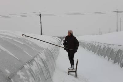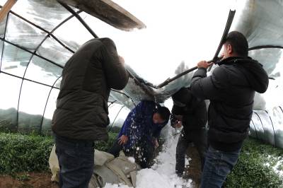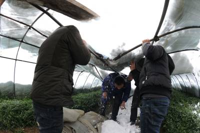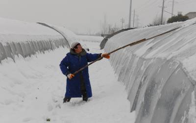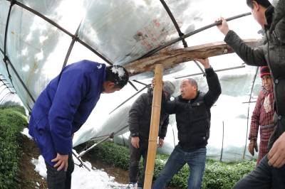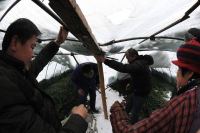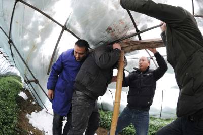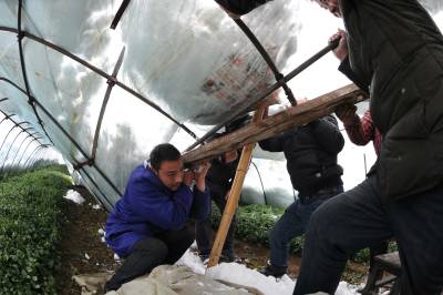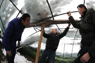 1月29日,在襄城区庞公办事处河心村,村民在整修被大雪压塌的蔬菜大棚,全力开展生产自救。据介绍,庞公办事处有蔬菜大棚7000多个,到29日清晨,有200多蔬菜大棚被压垮,我市全力开展自救,抢修大棚,以确保市场供给。据省农业厅提供的信息显示,截至28日16时,此次低温雨雪冰冻天气已造成蔬菜、油菜、小麦、茶叶等在田作物不同程度受灾,救灾工作有序开展中,农业部门正进一步密切关注灾情发展,及时指导各地做好防灾减灾工作,努力将灾害损失减少到最低限度。