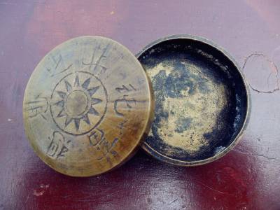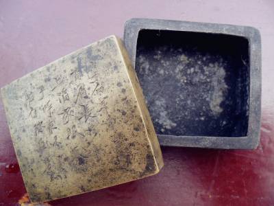 旧时至20世纪50年代末,学童均使用毛笔写字(1950年,宜昌市夷陵区分乡区只有一支钢笔),用石刻砚窝(即砚台)磨墨。墨是一块长2寸左右,宽不足半寸,厚2分余的长方体。砚窝里加几滴水后,用墨在砚窝里就能磨出墨汁来,用于书写作业。大户人家的学童不带砚窝和墨,使用的是装有浸透墨汁棉花的铜墨盒子。20世纪60年代,学生书写工具增加了铅笔、钢笔、圆珠笔和玻璃瓶装墨汁,使用墨盒子的习俗逐渐消失。2014年,宜昌市夷陵区分乡镇联合村陈方友还保存着祖辈传承下来的两个铜墨盒子。圆型墨盒盖上阴刻有国民党靑天白日旗和“蓄纯正之思想”6个字,长方体墨盒盖上阴刻有杜甫《饮中八仙歌》中的“李白斗酒诗百篇,长安市上酒家眠,天子呼来不上船,自称臣是酒中仙。”诗句。(视界网 袁国悦 摄)