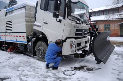 29日上午,记者在位于十堰经济技术开发区白浪中路的东风斯诺威科技(北京)有限公司十堰分公司看到,工作人员正紧张地在一台垃圾清扫车的车头部位组装除雪设备,经过动力连接和性能测试,安装除雪设备的除雪车很快就投入了使用。在白浪路的机动车道上,一台安装在东风皮卡上的扫雪机正在轰鸣作业,所到之处路面上的积雪薄冰翻滚堆积,车身后留下的是干净的路面。