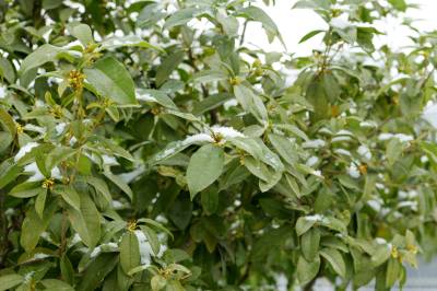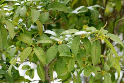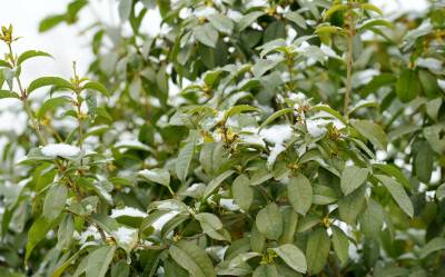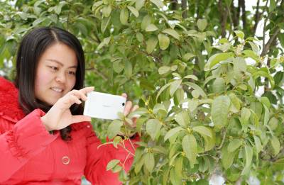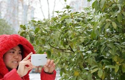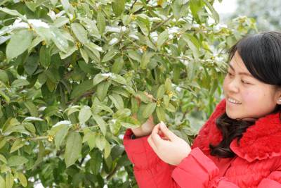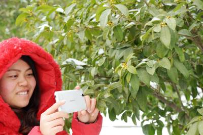 当日,保康县沿河公园里的桂花在雪中竞相绽放,引得游客踏雪寻香,纷纷在桂花树前观赏、拍照,陶醉在芳香四溢的公园里流连忘返。(视界网 陈泉霖 摄)