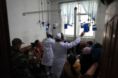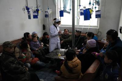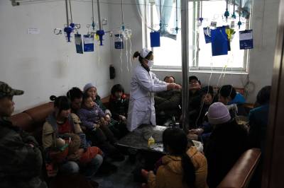 1月30日,湖北省咸丰县人民医院坪坝营分院,病人围着炉火输液。近日当地气温骤然下降,以感冒为主的病人猛烈增加。医护人员提醒广大市民,寒气袭人,尤其要注意保暖防病。