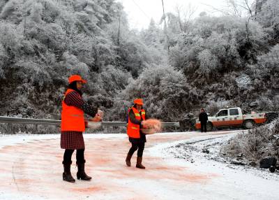 1月30日,在海拔1600多米的建-磺(建始-磺厂坪)公路陡坡弯道危险路段,建始县公路部门工作人员在忙着撒盐除雪融冰,确保道路安全畅通。 连日来,受强冷空气影响,建始县境内高海拔地区出现恶劣雨雪冰冻天气。该县迅速启动紧急应急预案,在各交通主干道及坡陡、急弯等危险、重点路段实施撒盐除雪融冰行动,最大限度保证群众交通出行安全。(本报视界网图片库卢家文、黄在位摄) 地址:建始县财政局卢家文 电话:13972401505