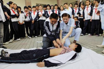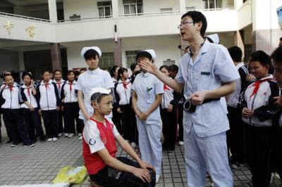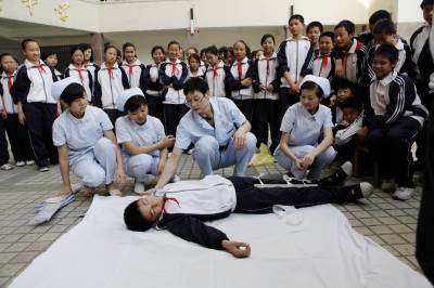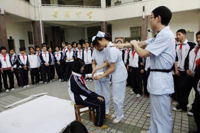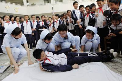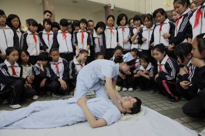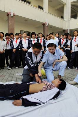 护士走进校园教急救5月11日,护士正在教孩子们急救知识。当日,在护士节与”防灾减灾日”到来之即,宜昌市中心人民医院急诊科护士走进市十中,为这里700多名师生讲解外伤处置、骨折处理、心肺复苏等急救项目知识,提高学生的安全自救意识。本报视界网黄翔但军摄