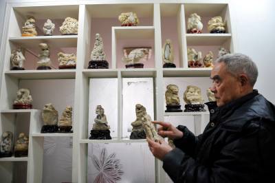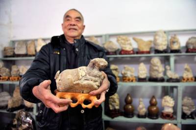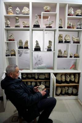 4、2月2日,游世贵观赏自己收藏的奇石。