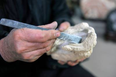 5、游世贵在奇石馆内对一枚云锦石进行打磨。(2月2日摄)