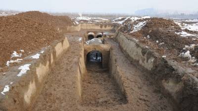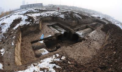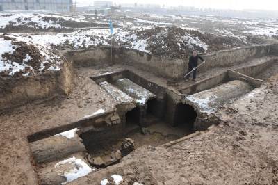 2月3日拍摄的中豪襄阳国际商贸城考古工地发掘现场。在前不久,市文物考古研究所在对该工地进行考古勘探中,发现墓葬,经过前期勘探清理,发现东汉、唐、宋墓葬16座,其中东汉墓葬12座,唐代墓葬3座,宋代墓葬1座。目前,该项目经省文物局批准,上报国家文物局,目前开始进行抢救性考古发掘。