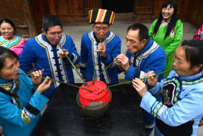 2月2日,湖北省咸丰县大路坝区蛇盘溪村,土家族村民正在品饮“土家咂酒”。