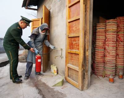 2月3日,湖北省十堰市郧阳区公安消防大队技术军官对十堰辉煌爆竹生产厂区进行了一次全方位的安全大检查,对消防水池,消火栓,灭火器,电气线路,生产员工会不会使用灭火器等逐一进行检查和抽查,以确保春节期间境内重点企业安全生产。 视界网周家山 摄