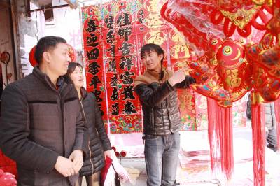 2月3日,就读2012级郧阳师专的竹山县宝丰镇上坝村大三学生陈龙阳(右)利用寒假时间在当地集镇卖年画、饰品。寒假期间,许多学生充分发挥自己的特长,选择不同的方式积极参与社会实践活动,体验生活,接触社会,亲身感受做事的艰辛,赚钱的不易。锻炼自己,教育自己。不仅为自己及时“充电”,还增加了一定的经济收入。