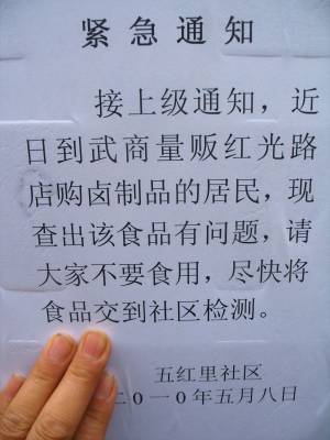 2010年5月11日,武汉汉阳,某小区里张贴的有关食品安全的紧急通知。8日,该小区所在的社区张贴通知要求在某超市购买卤制品的居民不要食用,并尽快上交检测。