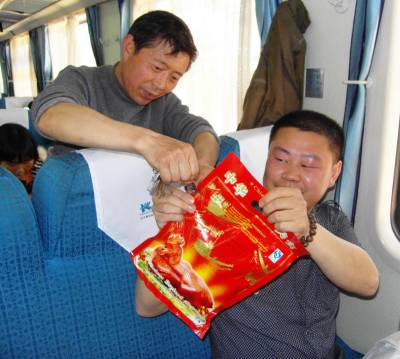 【通讯员罗超】5月10日下午2时许,北京西开往宜昌K49次旅客列车15号硬座车厢一位东北的刘先生(35岁,辽宁辽阳人,欲到郑州出差),因旅途饥饿,需要进餐。在打开北京烤鸭密封袋时,怎么也撕不开,可又没携带小刀剪,便向乘警求助。乘警当时身上也没有小刀剪,又向车厢其他旅客求援。话音刚落,来自湖北宜昌民工余先生(46岁,湖北兴山县高桥镇人,目前在安阳铁矿务工)递过来一个指甲剪,协助刘先生,打开了烤鸭袋。民工余先生助人为乐的善意之举,旅客纷纷投来了赞许和尊敬的微笑,整个车厢显得分外温馨与和谐。图为民工余先生正在用指甲剪帮辽阳刘先生剪开烤鸭密封袋。