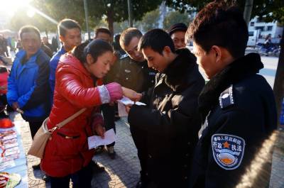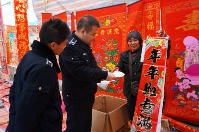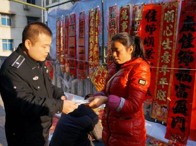 2月4日,郧阳区执法局为照顾城区困难家庭,在春节前临时开设郧阳路东段年画春联一条街,让困难家庭年前摆摊卖年画春联挣点过年钱,当天有20多家业主顺利的拿到临时占道经营凭证。   视界网周家山 摄