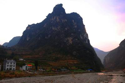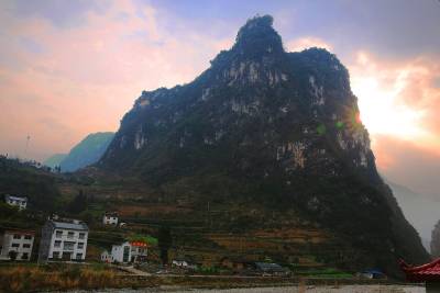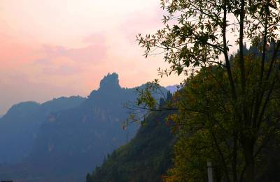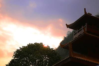 农历腊月的黄昏,远树凝寂,山色如墨,一只戢鳞潜翼的“飞鹰”静静伫立在山水之间,高昂着头颅,睥睨天下。在它的身后,阳光烧红了漫天的云彩,绽放出万道金光,为它披上了圣洁的霞衣。出现这个冬日奇观的地方,叫圣天观,是屈原故里——湖北秭归的另一个神秘所在。