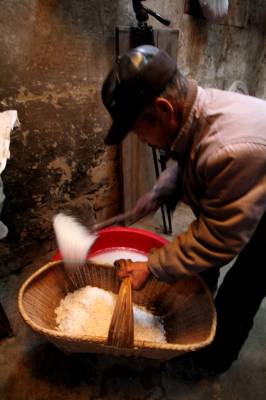 尽管舂米已成如烟往事,可在老一辈家乡人心中,它饱含着不少历史记忆,甚至催化了一种情结。乡村一般叫“舂对”,舂米所用工具,实为石碓。该物由大块青石凿成的碓和臼构成,碓也有用大树干制成,碓咀用铁皮包裹,原理如同中药铺里面用的捣药罐,一个铜锤加上一个铜罐,只不过石碓和石臼更显巨大罢了。世人巧妙运用杠杆原理,把石臼埋进地下,还往石碓处榫上一根木长杆。到了舂米的时候,一人站在杆头,踩下杆头,石碓提高,松开脚,石碓砸下,反复直至完工。舂米粉时,只需将泡好的糯米倒入石臼里,反复上下舂,直到将米舂成粉状,取出来用箩筛一筛,循环往复,直到剩下少许米头。
