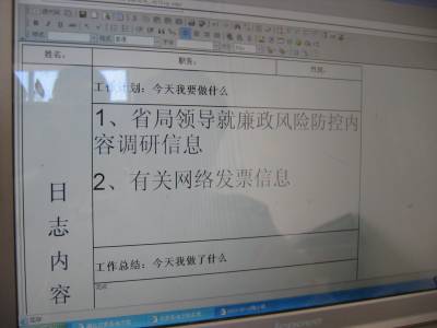 《云梦地税电子日志促工作》5月12日,云梦地税局干部陶小明在电脑上写自己当日的电子工作日志。今年以来,云梦地税局干部人人坚持写电子工作日志。日志内容主要包括两大类,一是工作计划:今天我要做什么;二是当日工作总结:今天我做了什么。局长、副局长及科室负责人对自己分管的工作和个人,在电子日志上进行点评,提出意见建议和工作要求。电子日志成为云梦地税人在每个有效工作日的必修课,有效促进了地税工作的开展。摄影报道刘猛陈保忠
