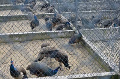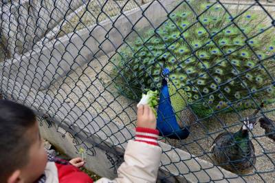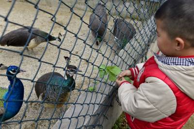 2月7日,一名小游客正在养殖基地内喂孔雀。