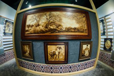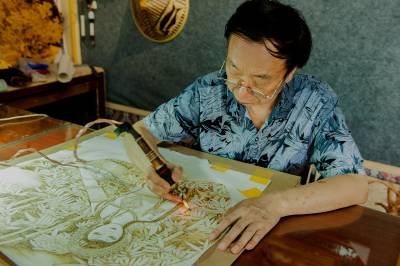 烙画,是一种古老的特殊的手工作画方法,即用烙铁作画。由于高温的作用,烙出深浅不同的褐色图案,决定了它天生的那种古色古香的韵味,其表现力有一定的浮雕效果,古朴典雅,清新秀丽。烙画以前仅限于在木质材料上烙绘,如:木板、树皮、葫芦等,现在,还可采用宣纸、丝绢等材质。过去,烙画艺人以铁针为工具,在油灯上炙烤进行烙绘;当代,制作工艺和工具不断改革,由“油灯烙”换代为“电烙”,将单一的烙针或烙铁换代为专用电烙笔,从而使这一古老的创作方式具备了前所未有的表现能力。目前,能够从事烙画艺术的艺人极少,能够功成名就的更是不多见。获得“湖北省工艺美术大师”称号的恩施州鹤峰县土家族文化人赵平国,现年65岁;1997年开始潜心钻研烙画,自创新技法、新工艺,用电烙铁、烙画笔在木板、丝绢上创作反映土家族历史文化、风土人情、自然风光的烙画。赵平国作为一名烙画家,他的可贵之处在于,不是简单地买些成品画稿“依样画瓢”,而是立足于恩施本土特色,从民族文化的土壤中吸取营养,创作出一批具有民族特色的作品,从而让烙画这门古老的艺术焕发出异彩。