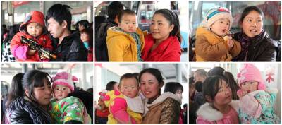 2月9日,在湖北省十堰市郧阳区客运站,部分乘客抱着孩子准备乘车(拼版照片)。当日为农历12月21日,外出务工的人们陆续踏上返乡的列车,不少父母怀抱孩子匆匆进入春运人流。虽然孩子们不知道春运是怎么回事,但他们却能切身感受到亲人怀抱的温暖。 (视界网 曹忠宏摄 )
