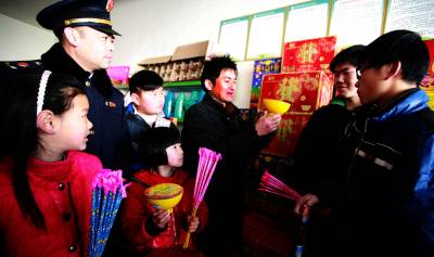 2月9日,湖北省武穴市供销社余川龙腰农家店主杜卫平(右三)和前来检查的工商干部为来店购买的大学、中、小学生宣传燃放烟花爆竹的有关安全知识!据了解,武穴市供销社发挥点多面广的售优势,配发和销售武穴市鑫凯烟花爆竹有限公司正规渠道供应的优质烟花爆竹产品,确保市民过一个安全健康的春节!视界网冯怡红摄影报道